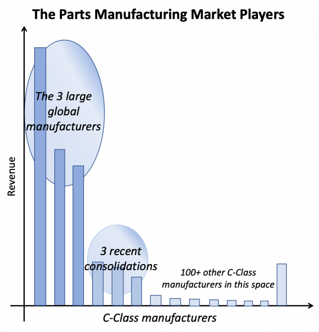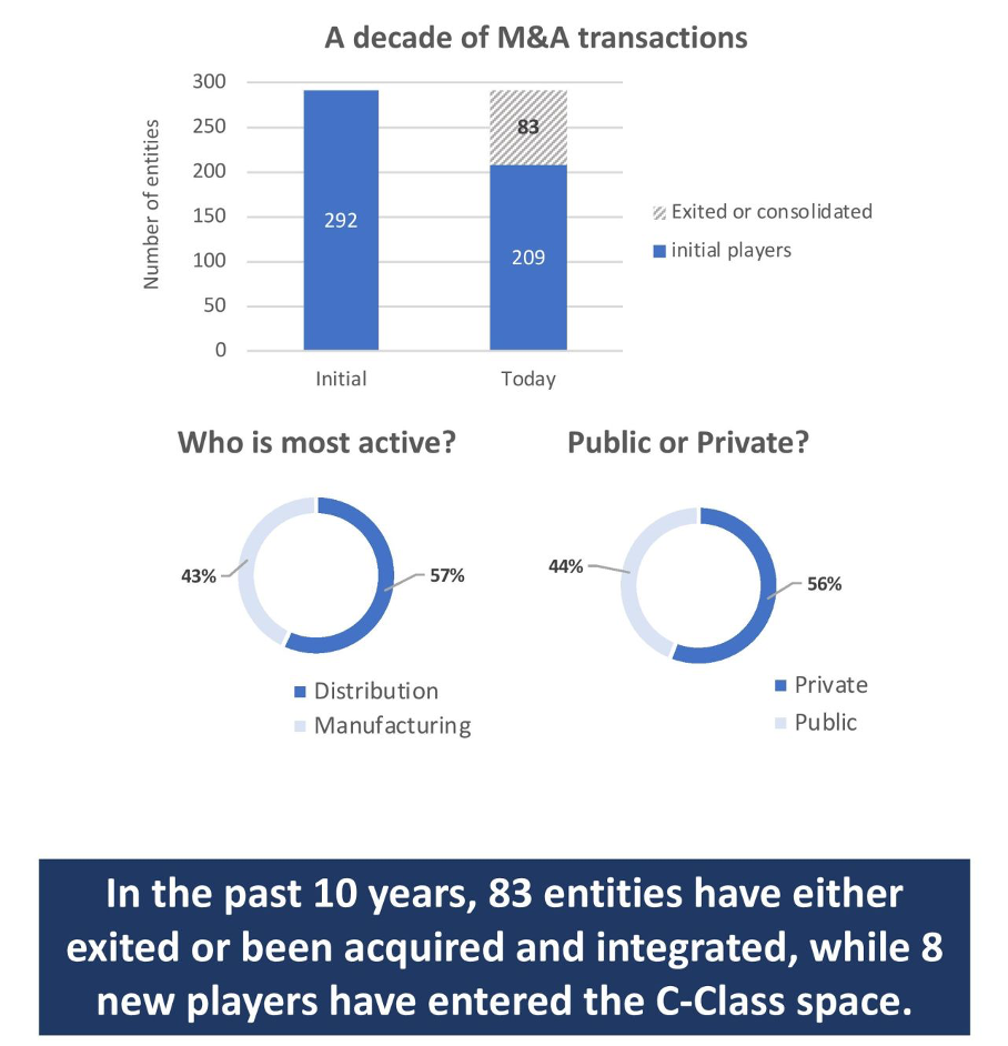 The three large manufacturers hold over half of the market for C-Class components between them. While the four recently emerging consolidated businesses (originally 30) account for some 20% of the market share. Mostly specialised independent manufacturers remain, probably to be gobbled up by private equity investors. And when might a merger of equals occur between the big players?
