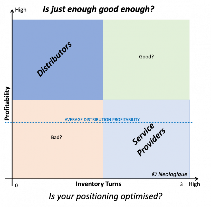 At Neologique we think that there is an optimum purchase price for each product and a margin that is commensurate with the WC risk, according to the served market segment. Service Providers “service fee” or “management fee” is shown on the chart and it becomes clearer when considering this model how and why distributors have migrated into the services activity. It is more of a challenge to move in the other direction.