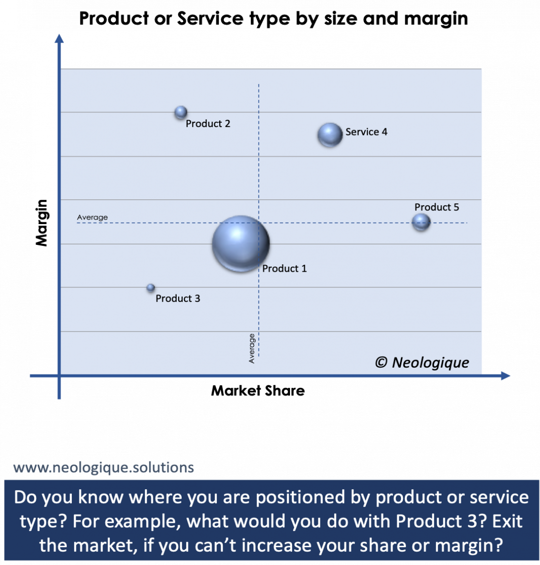Knowing how each one of your services or products performs for the business is crucial as you strive to enrich the returns for your stakeholders. Every little incremental improvement will flow to the bottom line. All of the products or services in the chart will have their own story to tell and an individual strategy to be developed, that together will combine to enhance the overall company results. Can you afford not to review your progress this way?