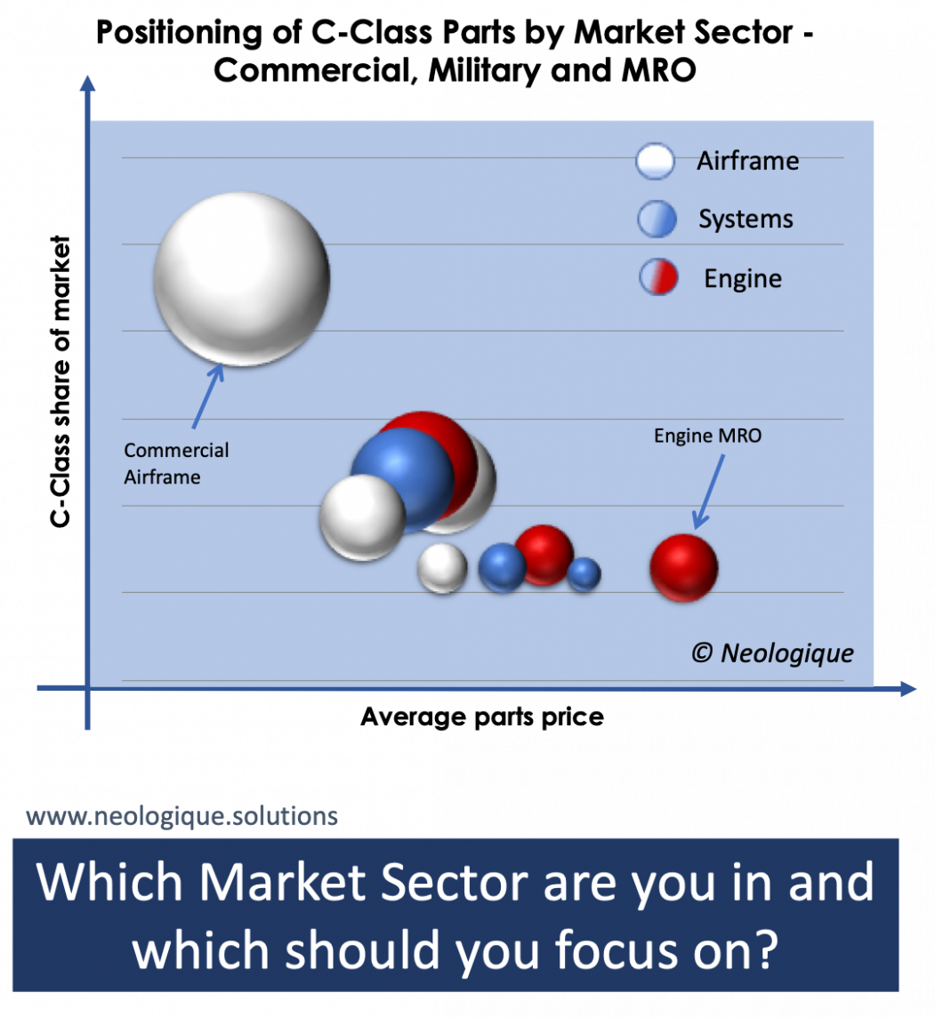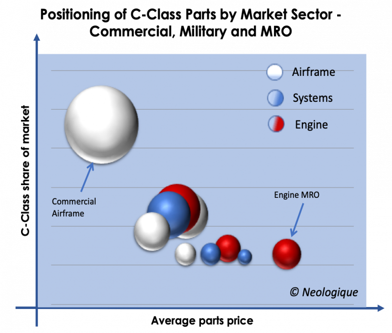 The commercial Airframe consumption of C-Class components makes it the largest and most competitive sector, with over 35% of the total market for Aerospace C-Class parts. The Engine MRO market provides the highest average price opportunity but clearly the material technology and the volumes of product consumed in this sector are significantly different from that in the Airframe sector.