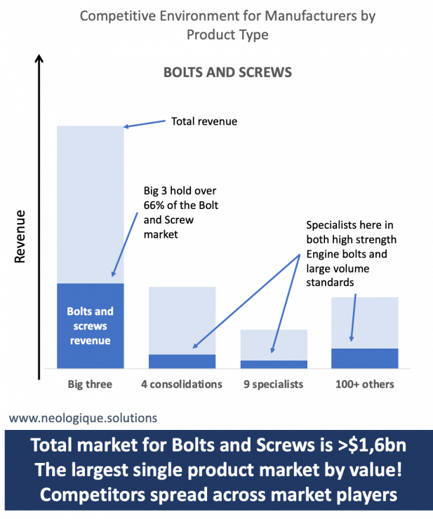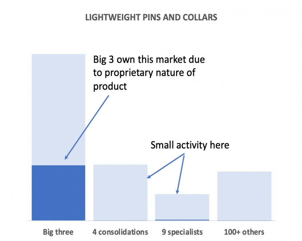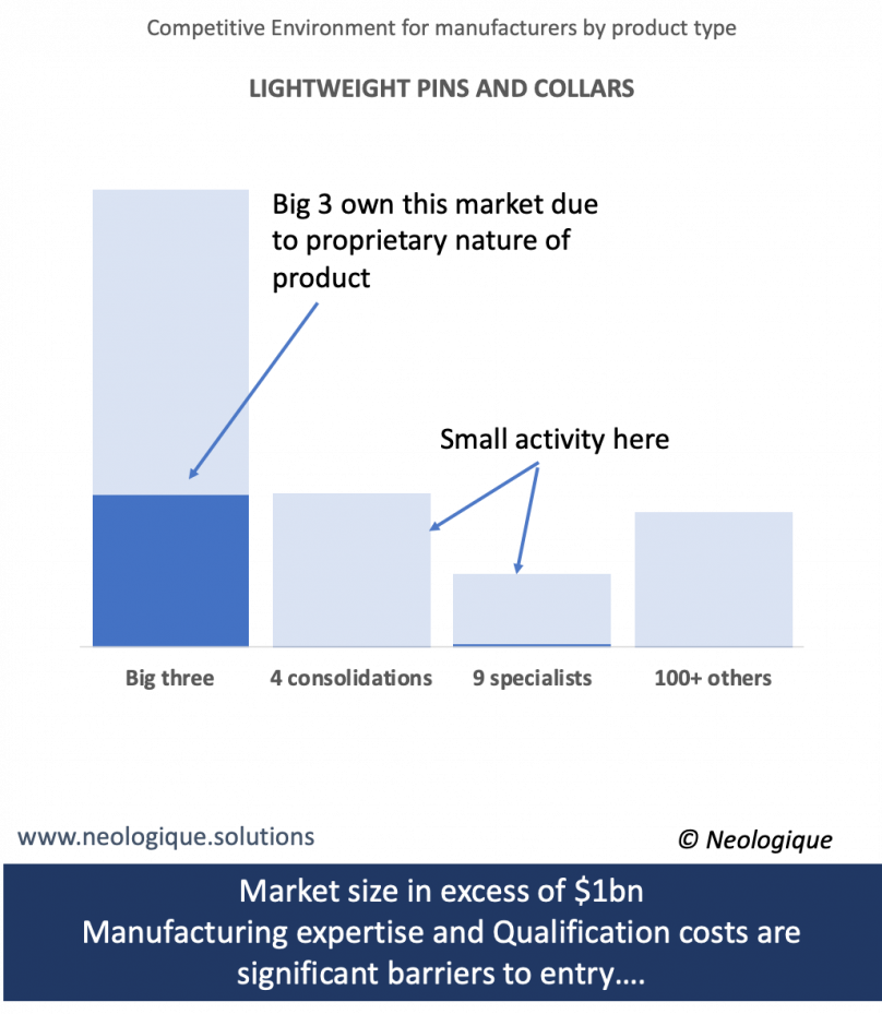 The importance of understanding the competitive environment in your market is crucial. Getting to grips with that at a product line level or even a part number level is highly desirous and the graph shows a summary of the market of >$1bn for lightweight pins and collars; aka Hi-Lok, Hi-Lite, Veri-Lite and Lockbolt pin and collar systems. The 3 big manufacturers are dominant in this space. What does it take to get into this market? A big investment and technical and manufacturing knowhow. Some small efforts have been made on certain products, with limited success, within the consolidated businesses and the specialist manufacturers, but there is a long way to go before the impact is felt by the big 3.