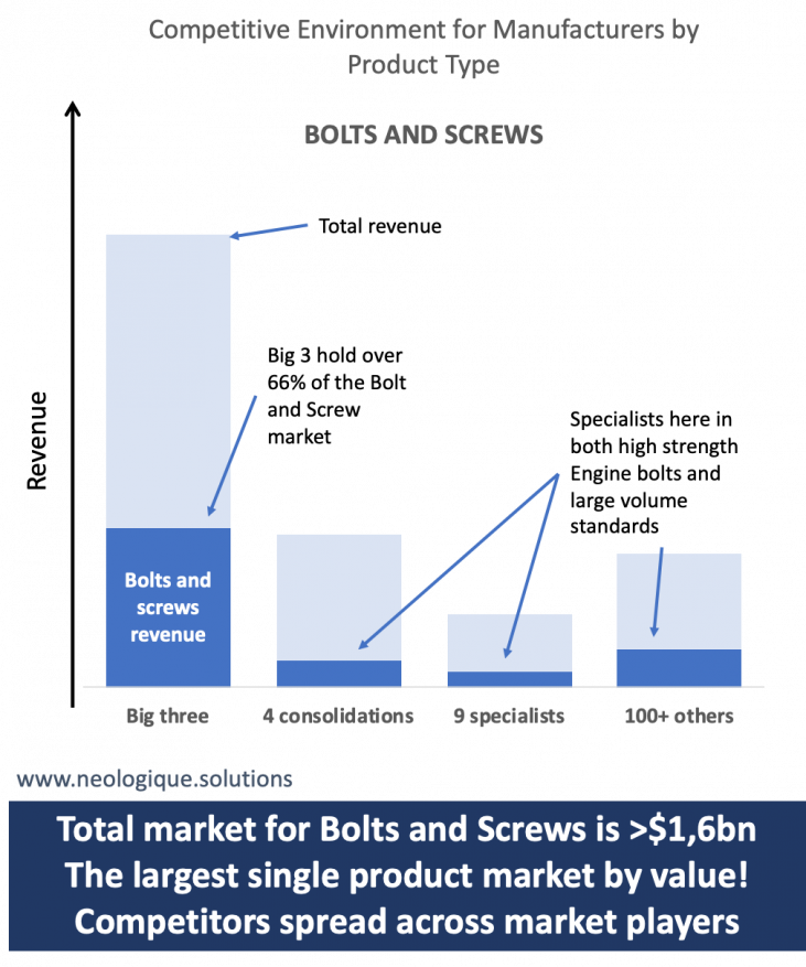The 3 big manufacturers are not dominant in this space but they do hold over 50% of the available market. Unlike the lightweight pins and collars, this product line lends itself favourably to the distribution market channel. Largely because the number of part numbers is significantly reduced due to no grip length variances, and as a result the volume by part number is significantly higher. The importance of understanding the competitive environment, by product type, in your market is crucial.