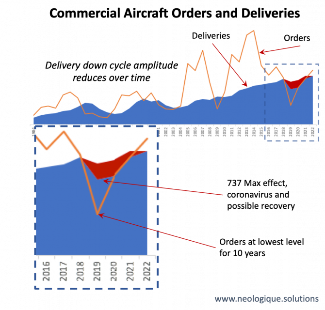 The down cycle is upon us, exaggerated by the impact of A380 and 737 Max and the pending effect of the Coronavirus. When will the cycle bottom out and will the amplitude of the downturn reflect current trends? At Neologique we believe the repercussions will be felt by the entire supply chain for three years.