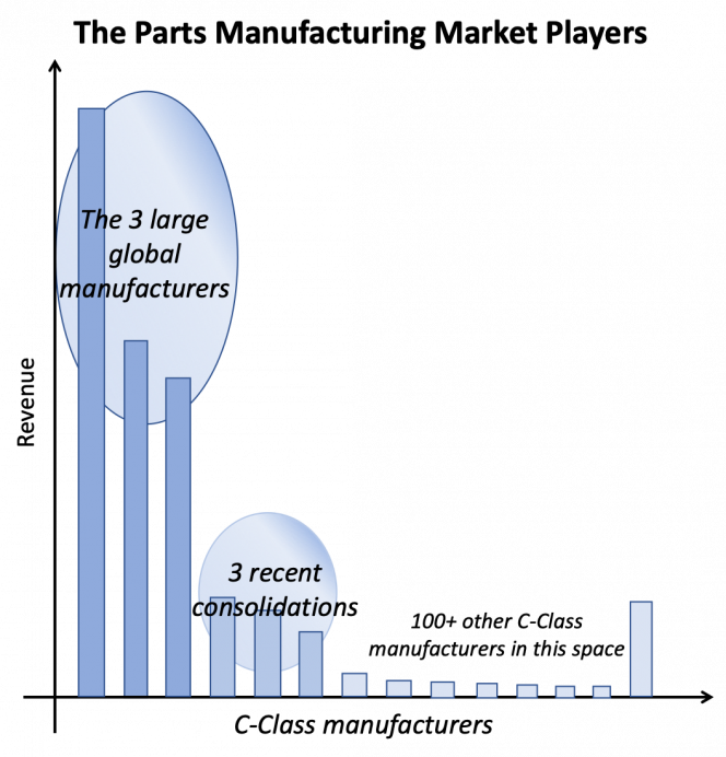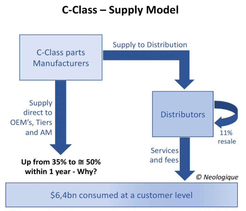 The C-Class parts market comprises parts manufacturers and their distributors or service providers. At a customer consumption level the market is split approximately 50/50 between the manufacturers and distributors. The manufacturing arena is dominated by 3 large players, Howmet, PCC and LISI and the distribution world is led by 2 suppliers, Incora and Boeing Distribution Services (BDS). Active consolidation starts to bridge the gap between the bigger suppliers and the rest, but it will take time.