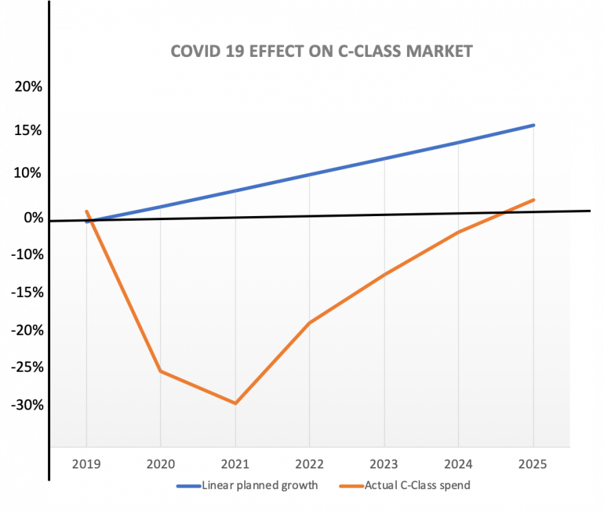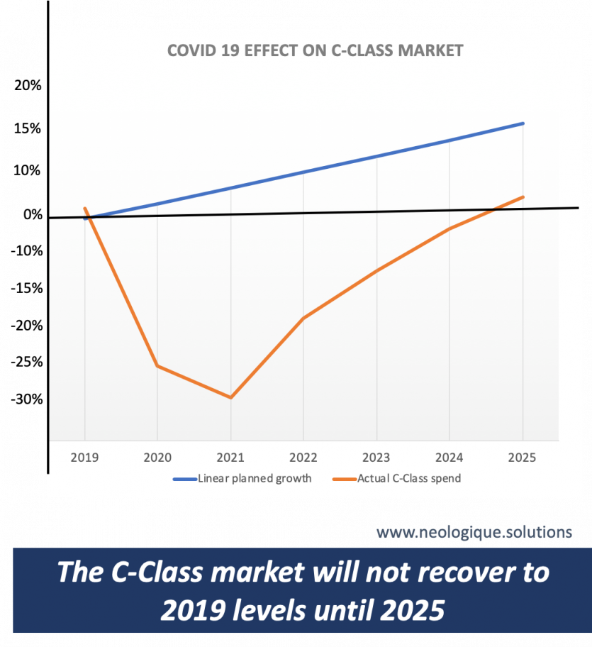 Still, we are in the middle of a 30% downturn in our industry that takes us through 2021, the year where we will see the bottom of the decline and $2 billion wiped off the annual purchase value of C-Class parts. We don’t see a return to global 2019 levels until 2025, where a significant gap to the industry plan prior to the pandemic prevails (chart shows a modest 2,3% growth per year). The impact will of course vary by sector and region.