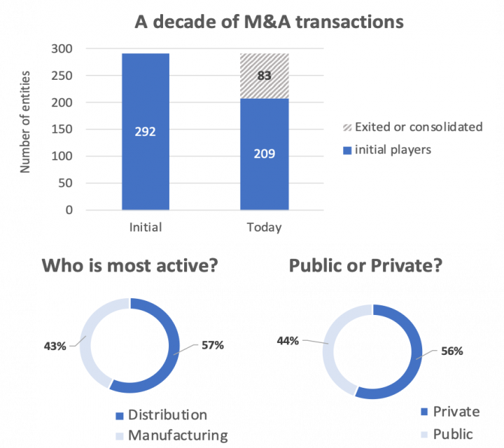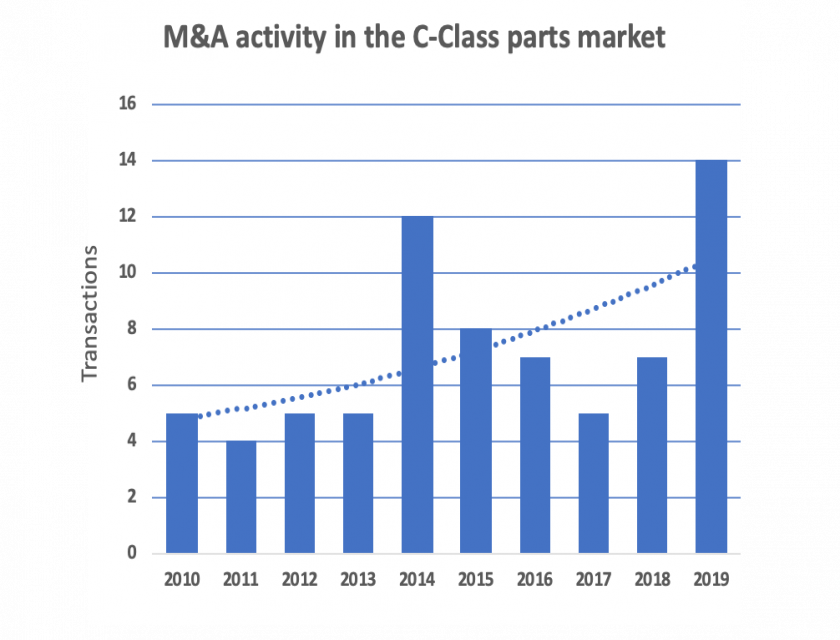 The C-Class parts market has seen 72 M&A transactions over the last 10 years with 83 entities disappearing, either through an acquisition or a market exit. 60% of all transactions were completed by 18 entities which is confirmation that consolidation is an ongoing and thriving strategy. The ability of players to compete in the global market demands a broader product portfolio, enhanced purchasing power and geographic presence; factors that drive consolidation. At Néologique we believe that investment into the C-Class parts market will continue its growth cycle, following the low level of activity in 2020.
