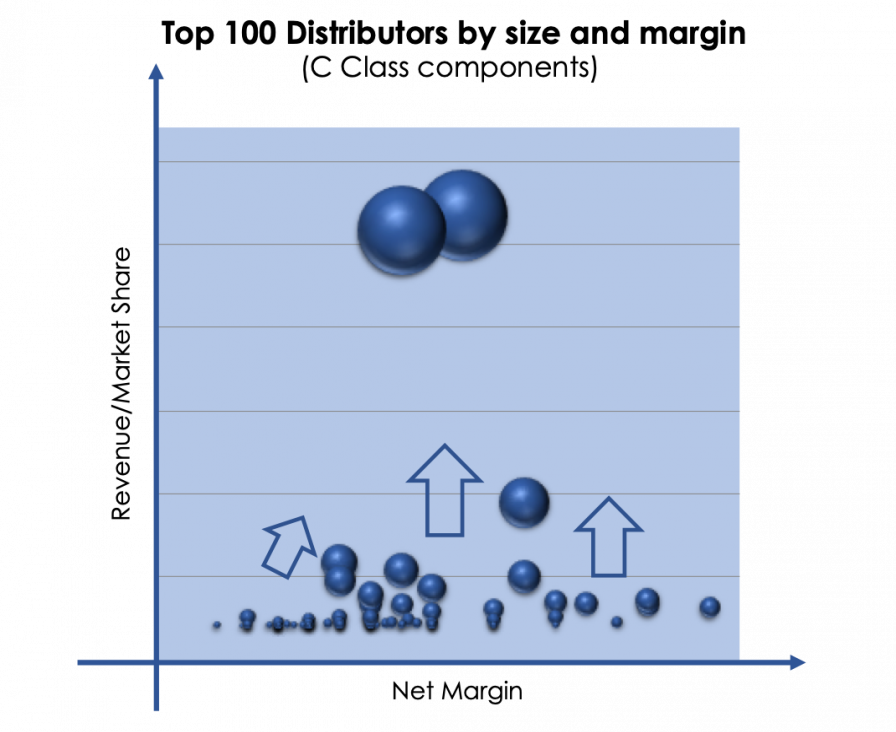 The bubble chart shows the top 100 distributors in the aerospace C-Class components market, positioned by their market share and margin. Of course, the two large players are well known to everyone, but most distributors are in the lower part of the chart. So, if you want to outpace the pack, how do you improve your margin or increase your geographic presence or determine which products or sectors (airframe, engine, systems, military or aftermarket) to focus on?