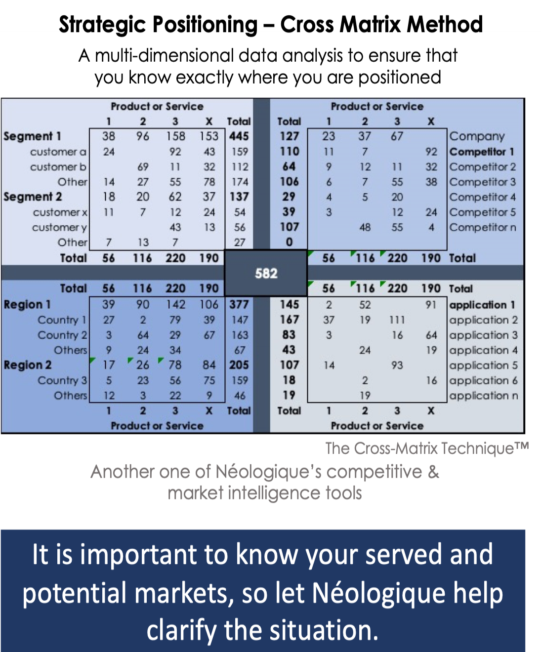 At Neologique, we know how to estimate almost any market, and we always do it both in volume and in value, which avoids often unreliable underlying price variances. Called the Cross-Matrix Technique™, and mathematically demonstrable, it results in reliable market data (+/- 5%), by using ad hoc matrixes like application x product, customer x application, competitor x products and country x market sector. All with a focus on the element of profitability.